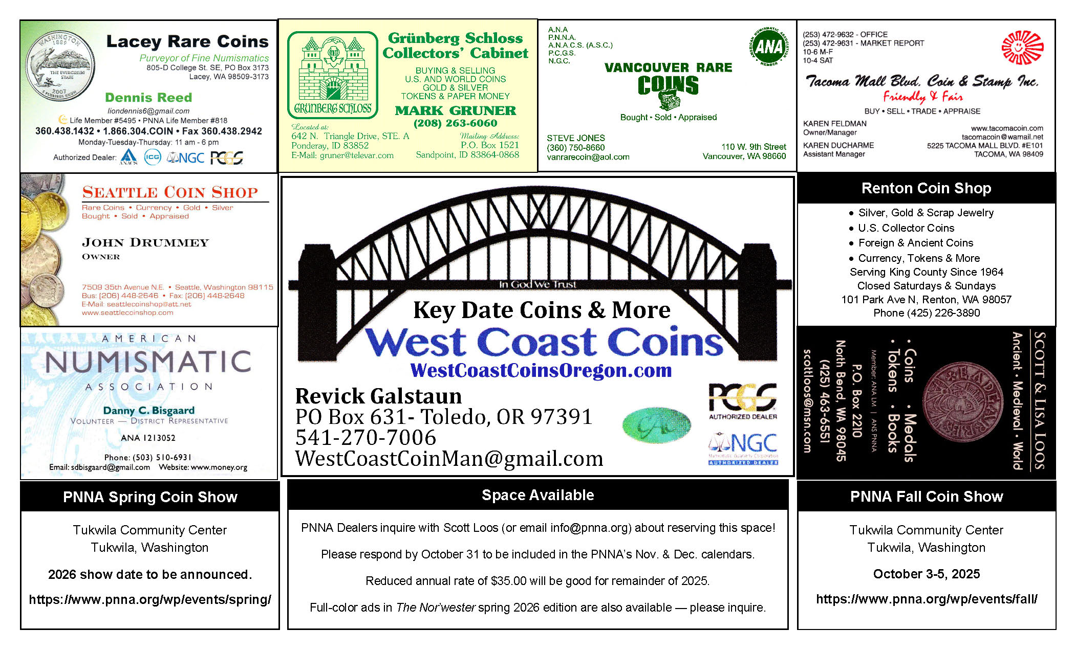 OCT 18-19 | Inland Empire Fall Coin Show | Kootenai County Fairgrounds Bldg. 1, 4056 N Government Way, Coeur d’Alene ID | Alan Franke, 509-595-0435 |